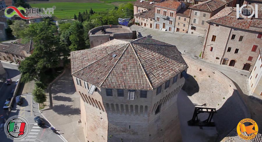 Riprese aeree a Mondavio con multirotore dotato di 5DMarkII. Le riprese aeree sono state effettuate per il progetto Gusta L’arancione del Touring Club per la produzione di un video di tutti i comuni Bandiere Arancioni delle Marche.